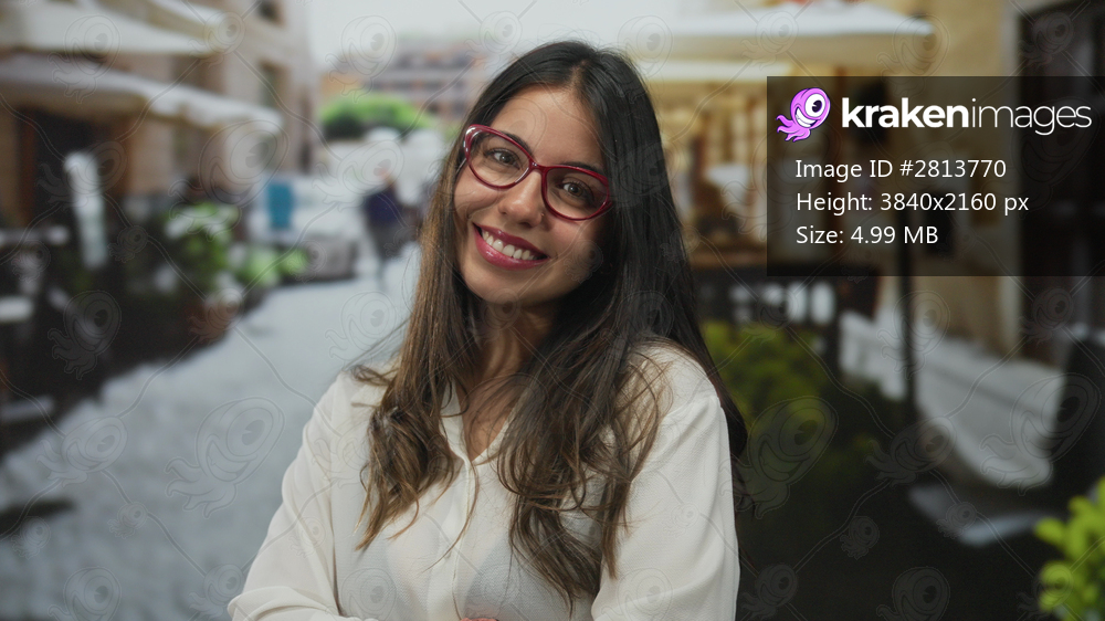 Smiling woman in red glasses standing on a street with restaurants and terraces, capturing an outdoor urban setting.