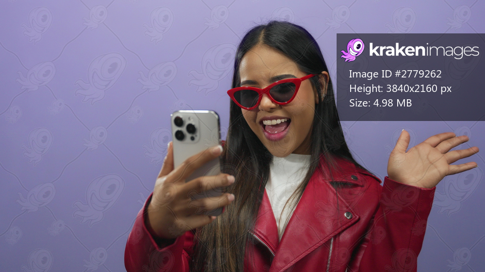 Smiling woman in red jacket and sunglasses takes a selfie with smartphone against a purple backdrop, exuding joy and connection.