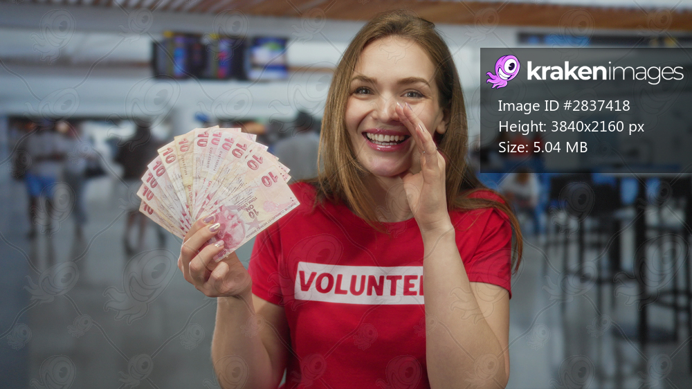 Smiling woman in red volunteer shirt holds a fan of banknotes at airport terminal; generosity happiness.