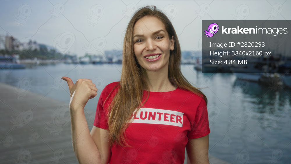 Smiling woman in red volunteer shirt pointing thumb toward a moored boat at port; community support positivity.