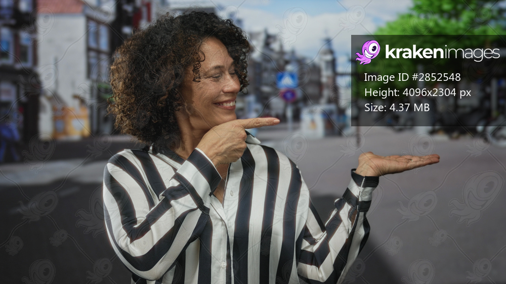 Smiling woman in striped shirt points finger to raised palm on busy city street; highlight attention optimism.