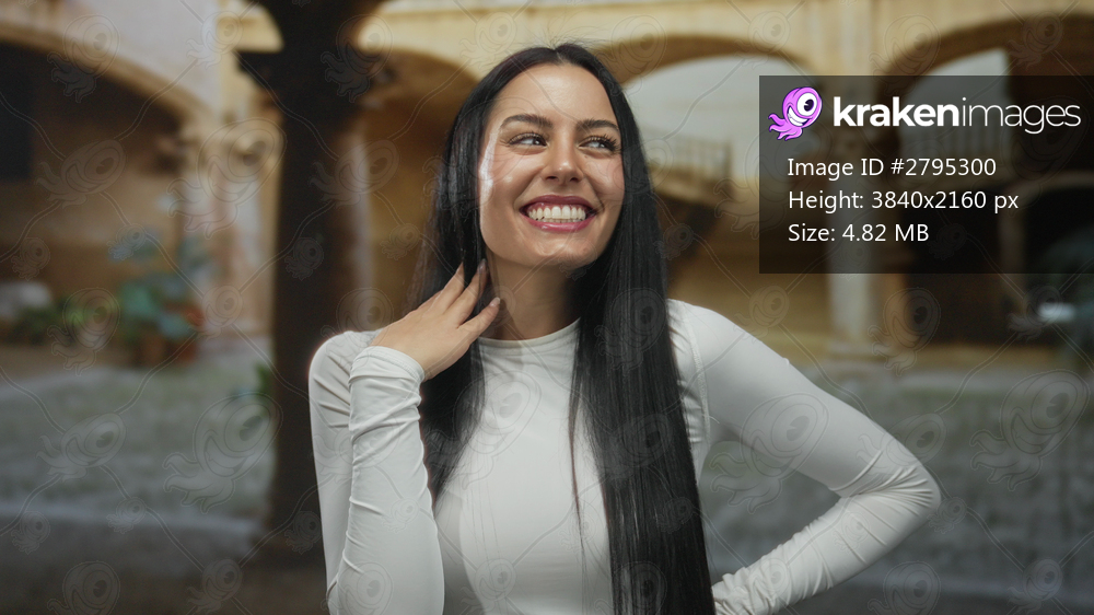 Smiling woman with long hair and white top outdoors in historic courtyard with arches and plants, showcasing vibrant energy and joyful expression.