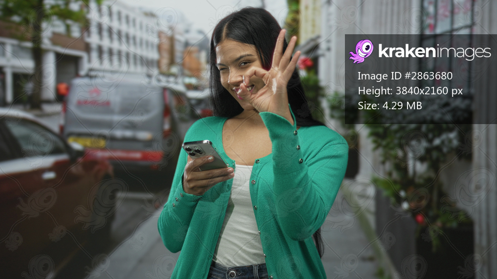Smiling woman makes ok sign and scrolls smartphone on sunlit street; approval happiness connection trust.