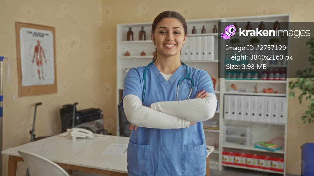 Smiling woman nurse in blue scrub with stethoscope standing confidently in hospital room showcasing medical environment and professionalism with organized shelves. - Kraken Images