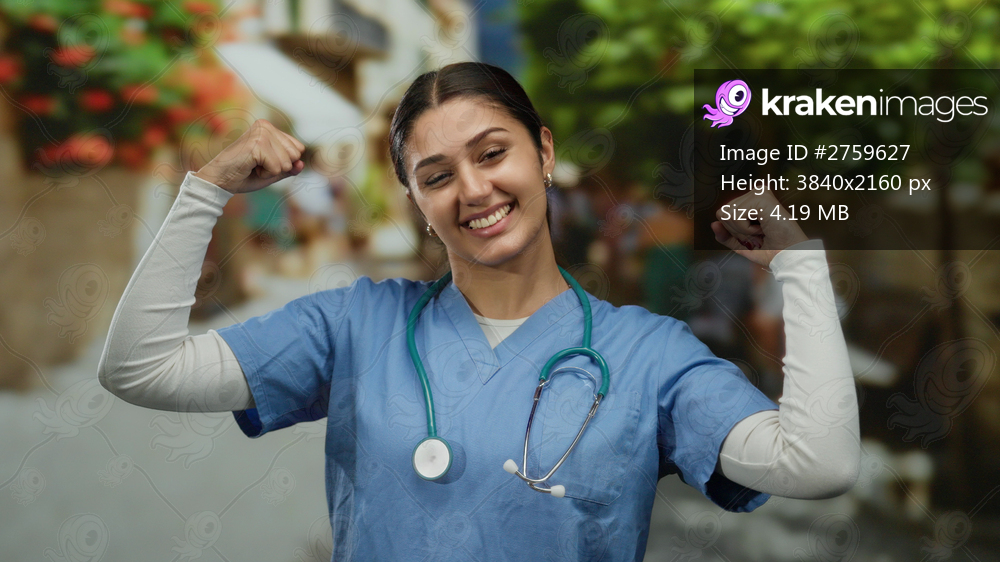 Smiling woman nurse in blue scrubs shows strength with raised arms on vibrant street background with stethoscope around neck in a joyful outdoor setting. - Kraken Images