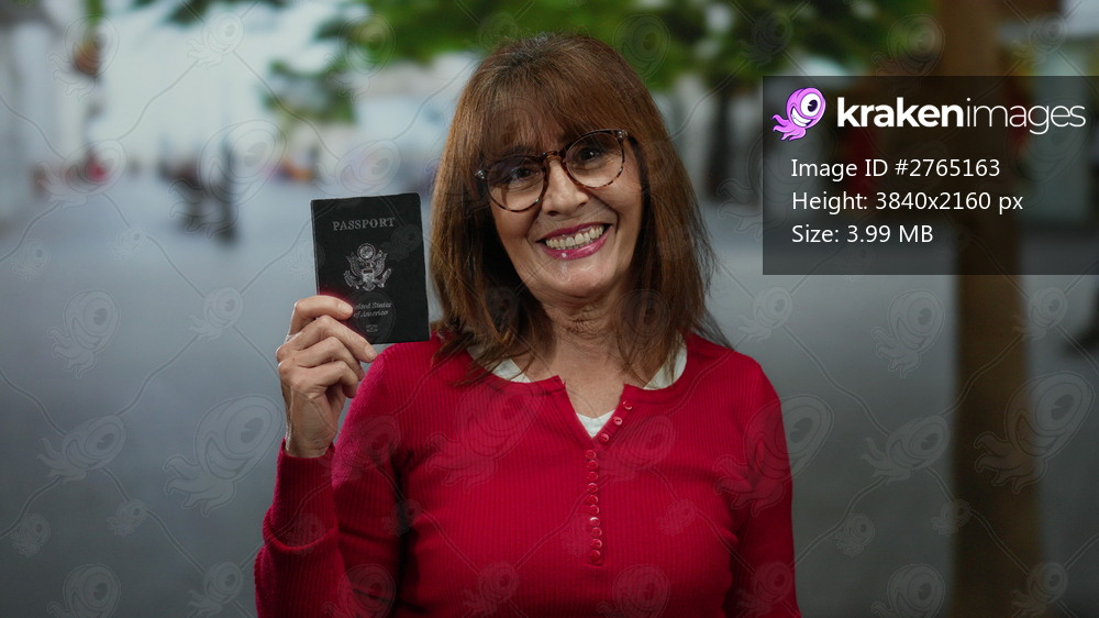 Smiling woman outdoors holds a united states passport, standing on a busy city street characterized by vibrant surroundings and a casual atmosphere, showcasing international travel theme. - Kraken Images