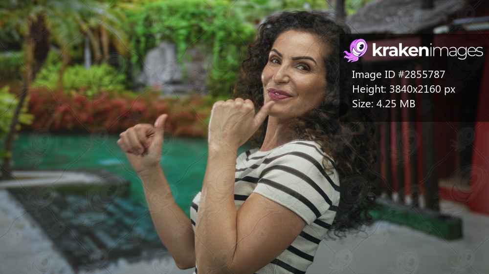 Smiling woman outdoors in striped shirt points both thumbs backward at hotel building corner; confidence.