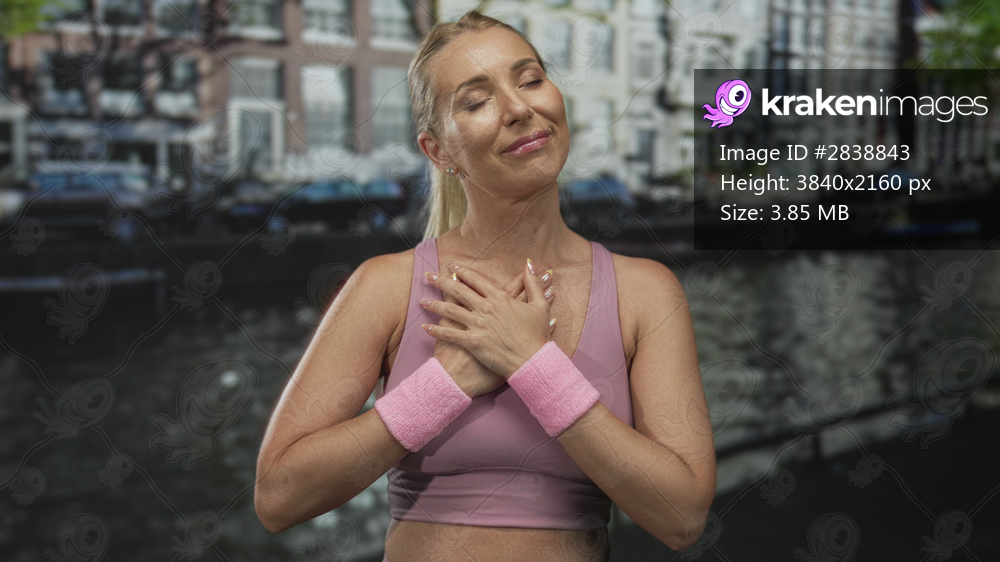 Smiling woman places hands over chest by canal under soft daylight as she takes a moment; inner serenity.