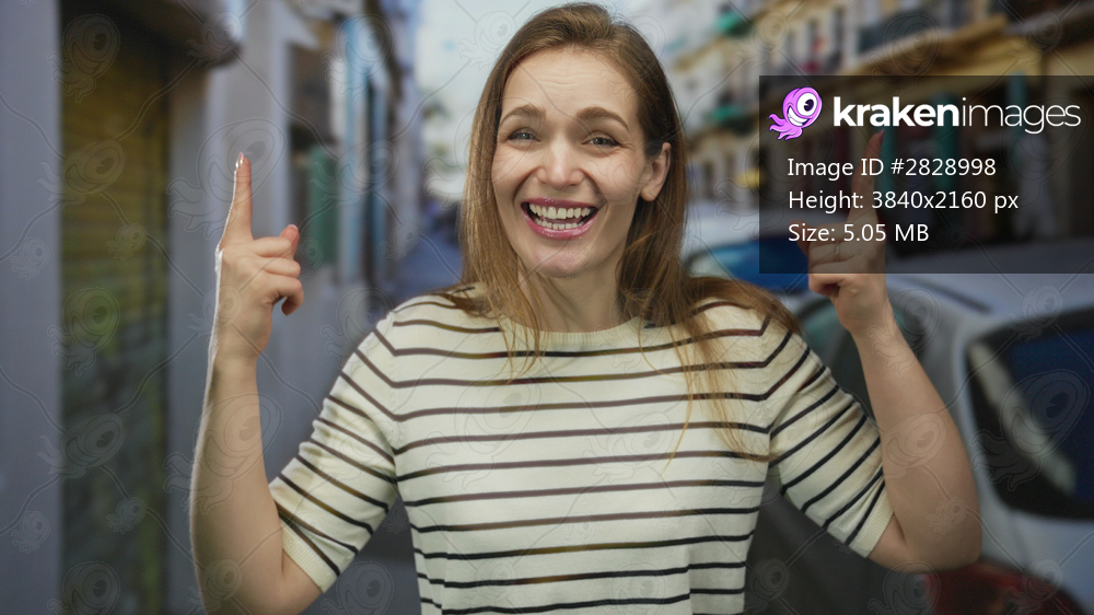 Smiling woman pointing finger to object on narrow city street lined with colorful buildings and parked cars; joy enthusiasm.