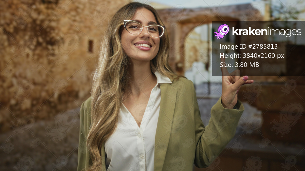Smiling woman pointing finger upward in sunlit courtyard; optimism confidence inspiration leadership.