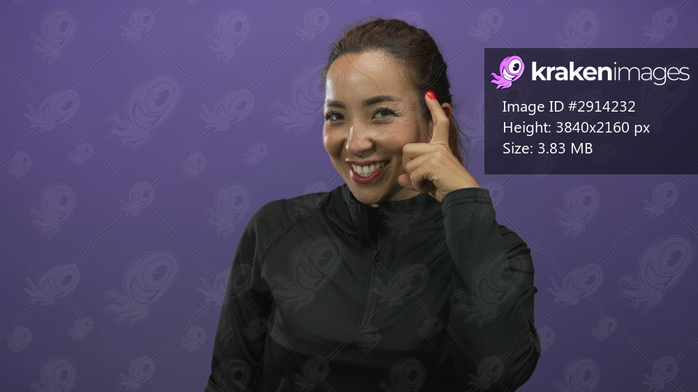 Smiling woman pointing her finger to temple in purple studio with black top and hair in a bun; thinking confidence clever.