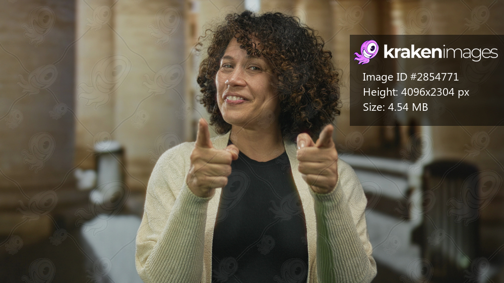 Smiling woman points finger to camera under tall historic columns in old town street; playful happiness.