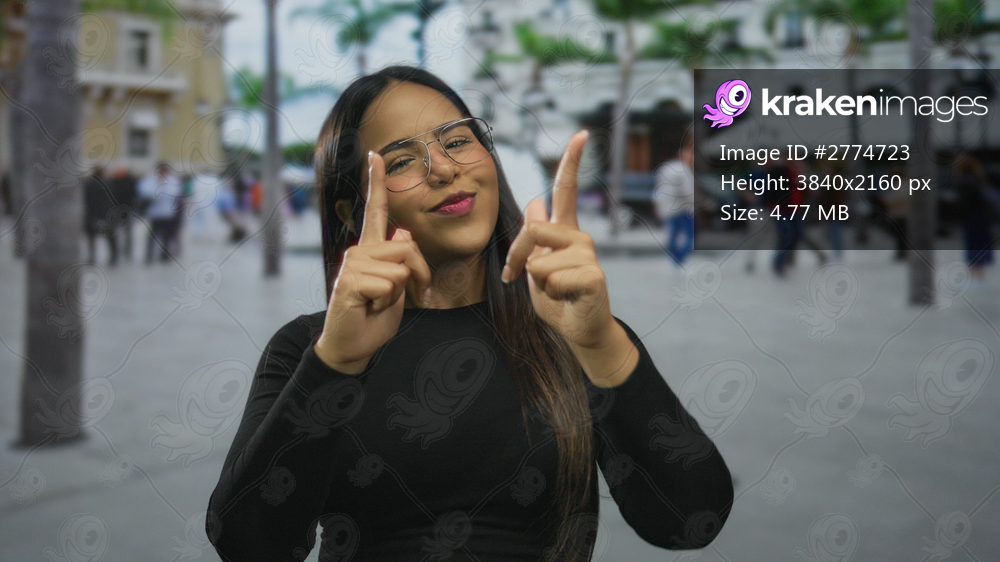 Smiling woman points fingers with confidence on a bustling street with people strolling by during a sunny day.
