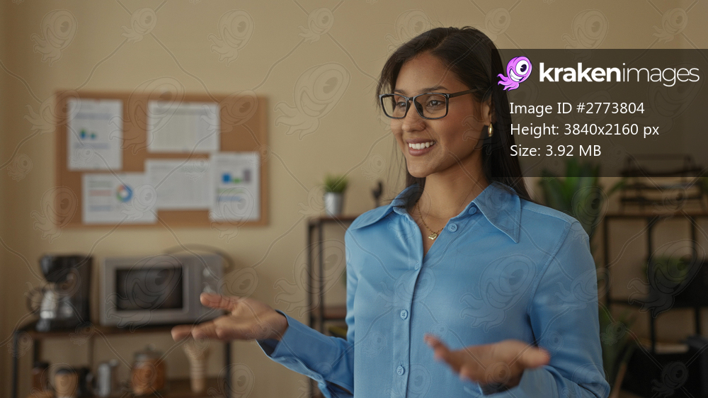 Smiling woman presenting in a cozy office setting with plants and a bulletin board in the background, wearing glasses and a blue blouse, conveying confidence and professionalism. - Kraken Images