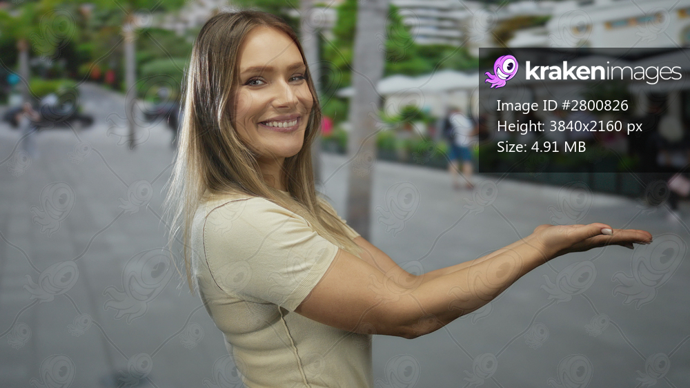 Smiling woman presenting on city street background, showcasing urban outdoor lifestyle with greenery and people in the distance, creating a lively urban scene. - Kraken Images