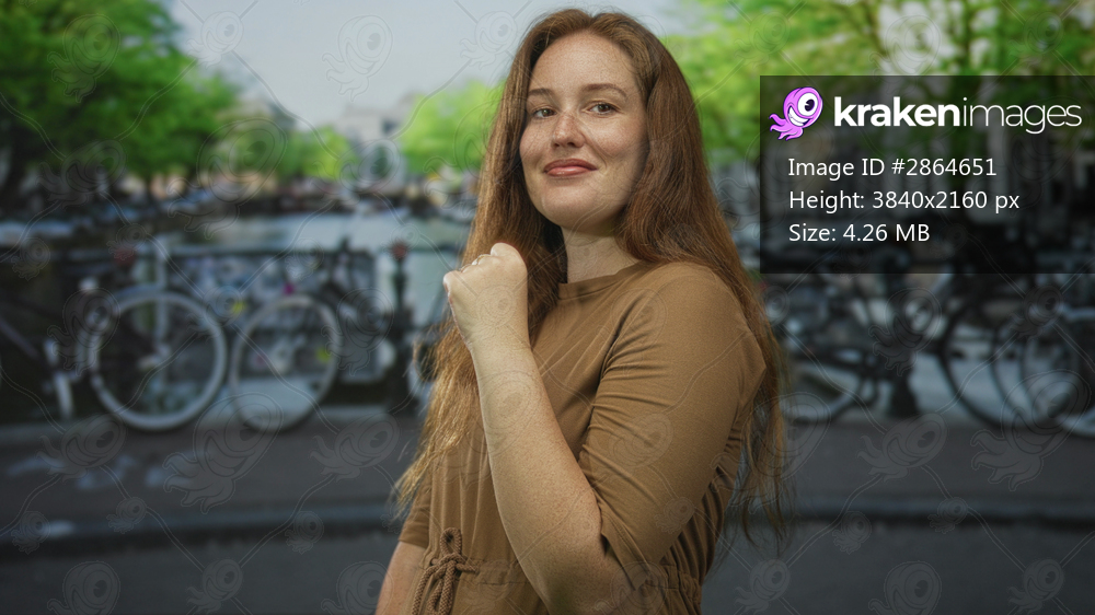 Smiling woman raising fist on canal street by water in amsterdam under bright sunlight; determination.