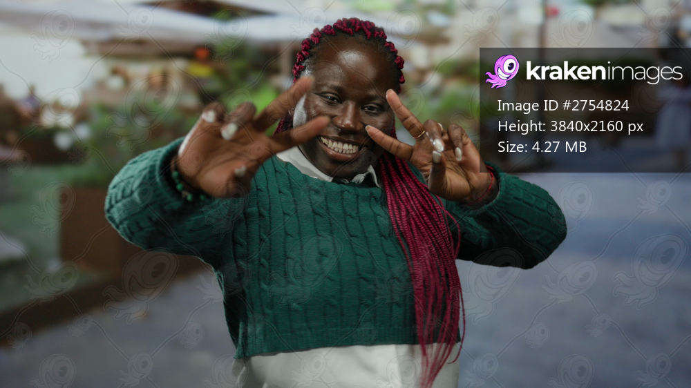 Smiling woman with red braids makes a victory gesture on a city terrace outside a restaurant capturing joy.
