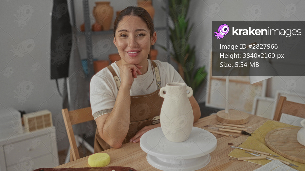 Smiling woman resting chin on hand beside a white clay vase on a turntable in a studio; creative focus.