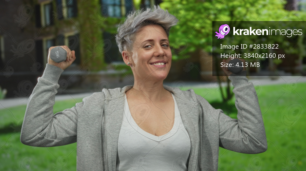 Smiling woman with short hair lifting two dumbbells in front of green building facade; empowerment resilience.