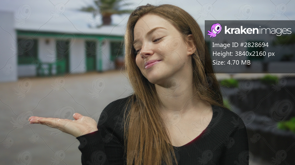 Smiling woman standing and presenting hand at building entrance during bright daylight outdoors; warm invitation.