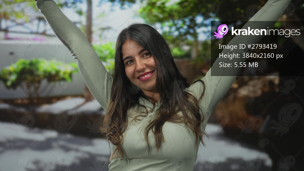 Smiling woman stretches arms upward in lush green park by a sunlit paved walkway under bright trees and warm sunlight; joy.