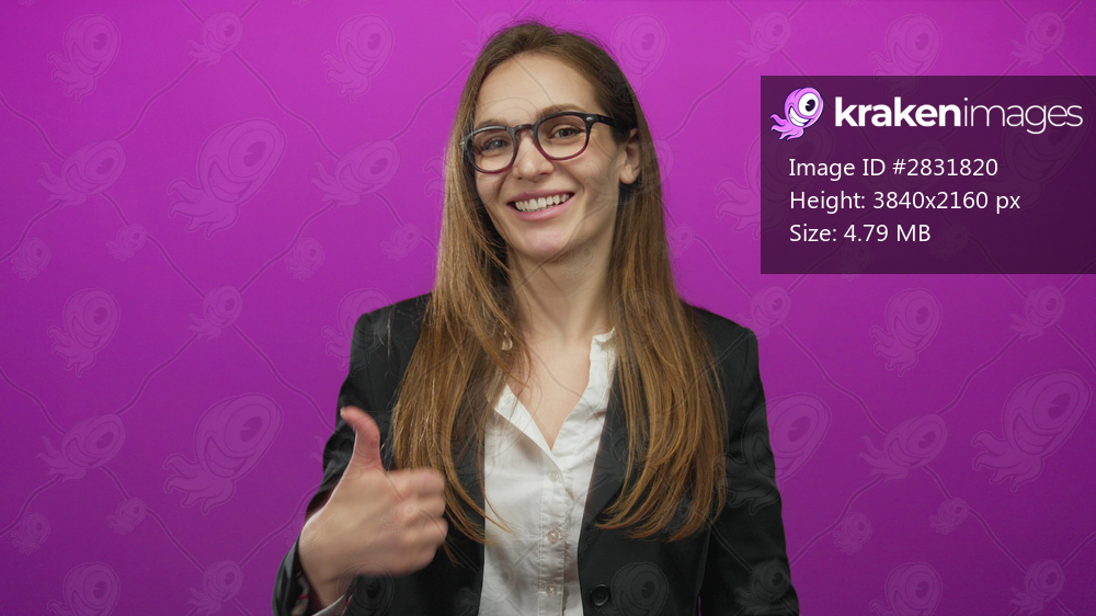 Smiling woman thumbsup gesture in purple studio wearing glasses brown hair and blazer over white shirt; approval confidence.