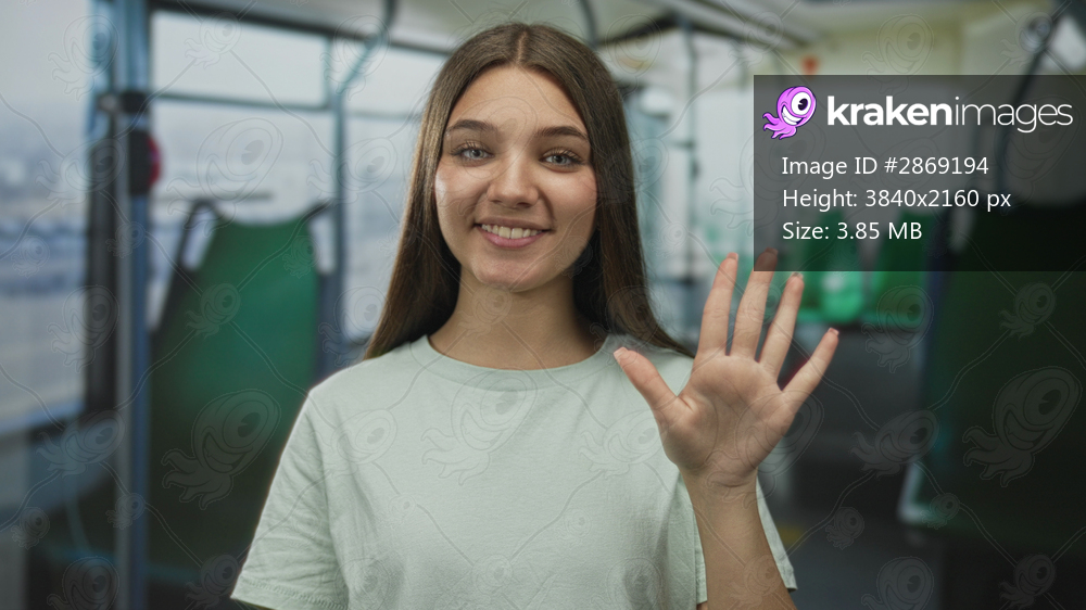 Smiling woman waving open hand inside a city bus with green seats and window view, facing camera; friendly greeting.