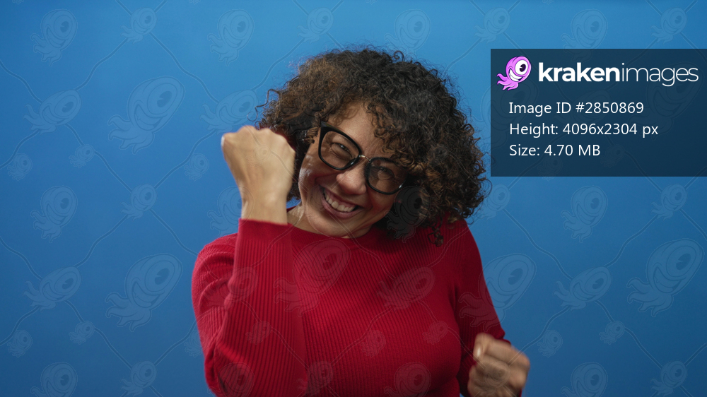 Smiling woman wearing a red sweater pointing her finger at viewer in studio against a bold blue wall; enthusiasm.