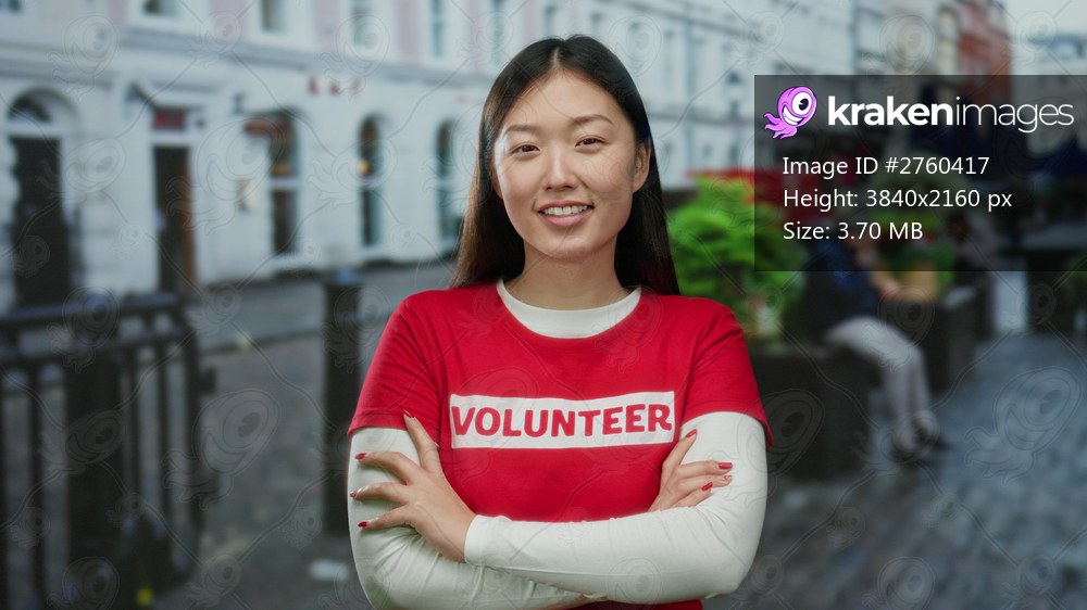 Smiling woman wearing a volunteer shirt stands confidently on a city street, embodying community spirit and outdoor engagement in a vibrant urban setting. - Kraken Images