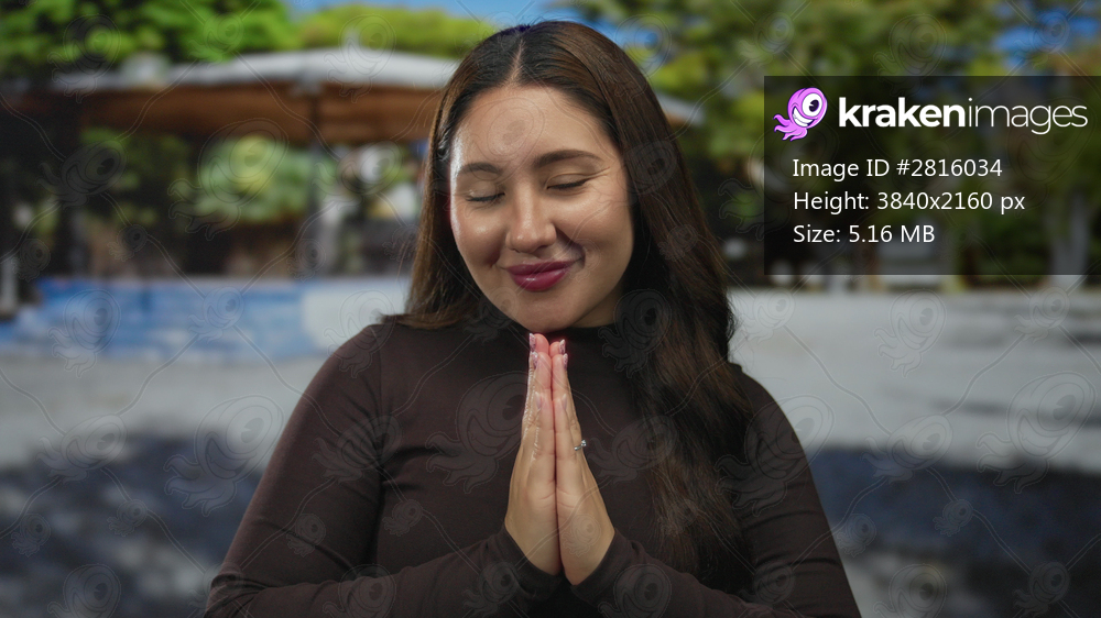 Smiling woman wearing dark turtleneck pressing hands together in sunlit green park; gratitude respect humility serenity.