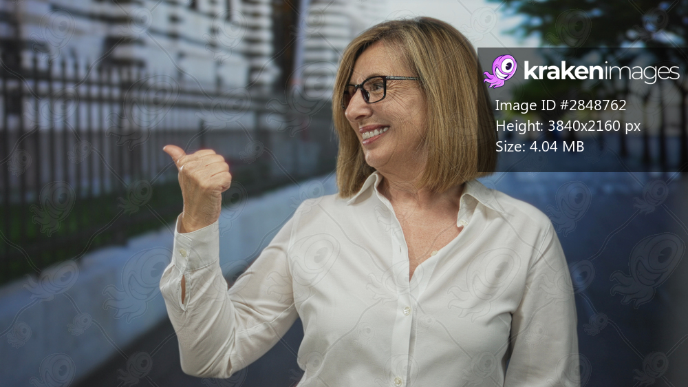 Smiling woman wearing glasses and white shirt shows thumb up gesture on city street pavement; optimism.