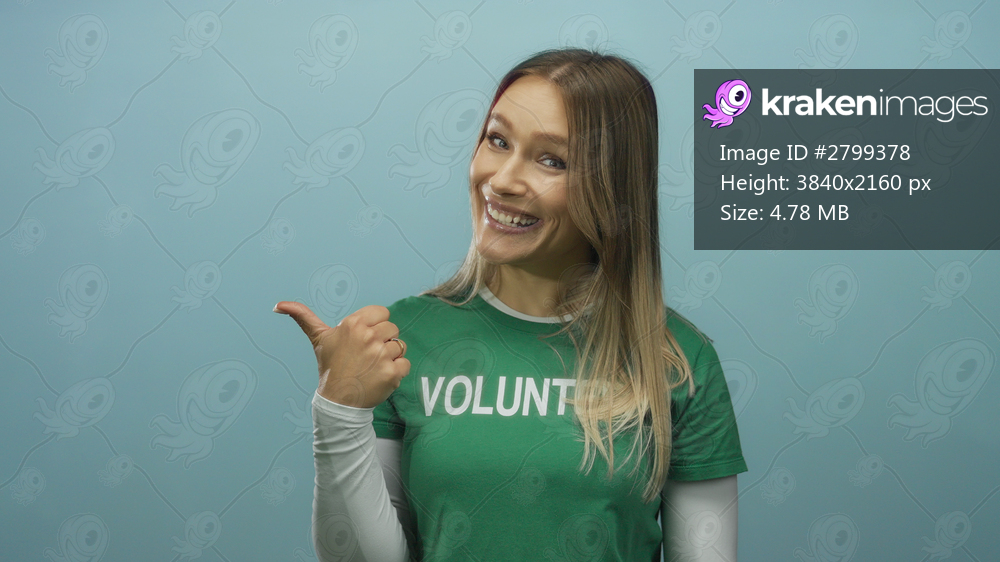 Smiling woman wearing green volunteer shirt giving thumbs up on blue isolated background