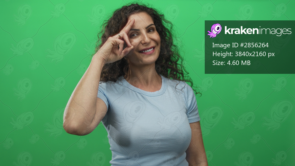 Smiling woman wearing light blue tshirt finger pointing to head as salute in green screen studio; warm greeting.