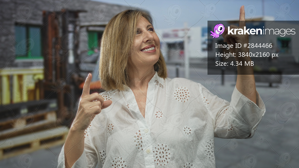 Smiling woman wearing white blouse pointing finger upward in street with building behind her; optimism.