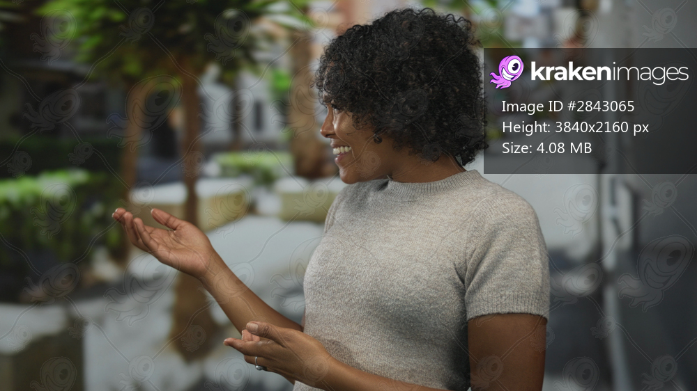 Smiling young african american woman with open palm by parked cars on busy street; friendly greeting warmth.