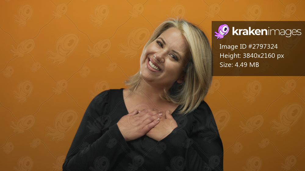 Smiling young blond woman in black blouse places hand on chest in orange studio; gratitude sincerity.