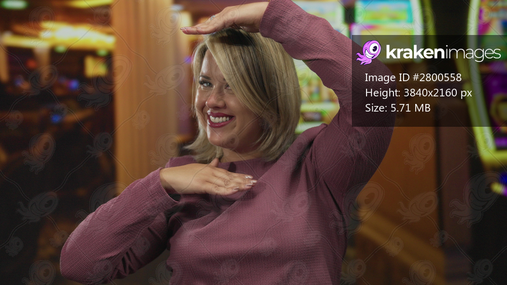 Smiling young blonde woman framing face with hands near slot machines in casino with cheerful grin; excitement.