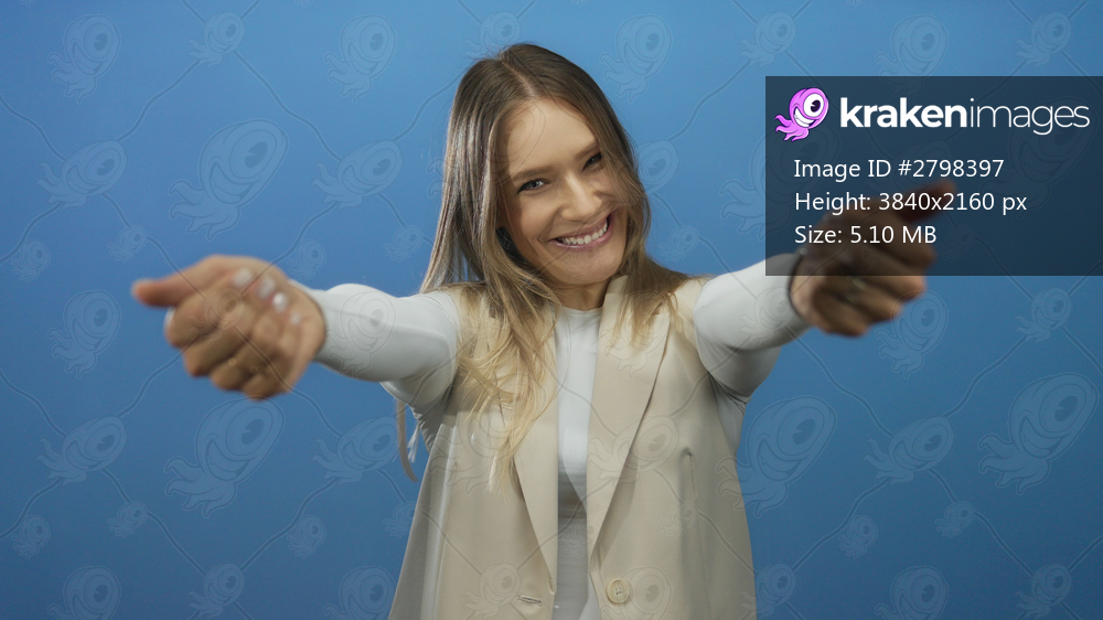 Smiling young blonde woman in a white shirt and beige vest gesturing over isolated blue background wall, conveying happiness and friendliness.