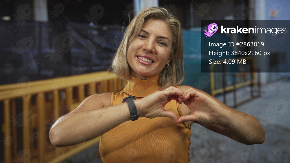 Smiling young blonde woman making heart shape with hands at urban building site in daylight; love unity connection warmth.
