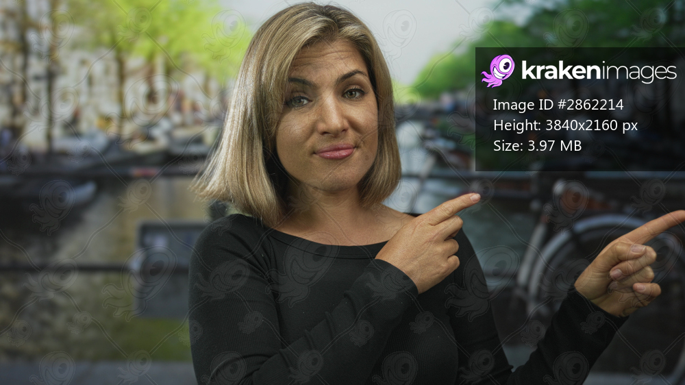 Smiling young blonde woman wearing black top points finger at canal on vibrant amsterdam street; draw attention.