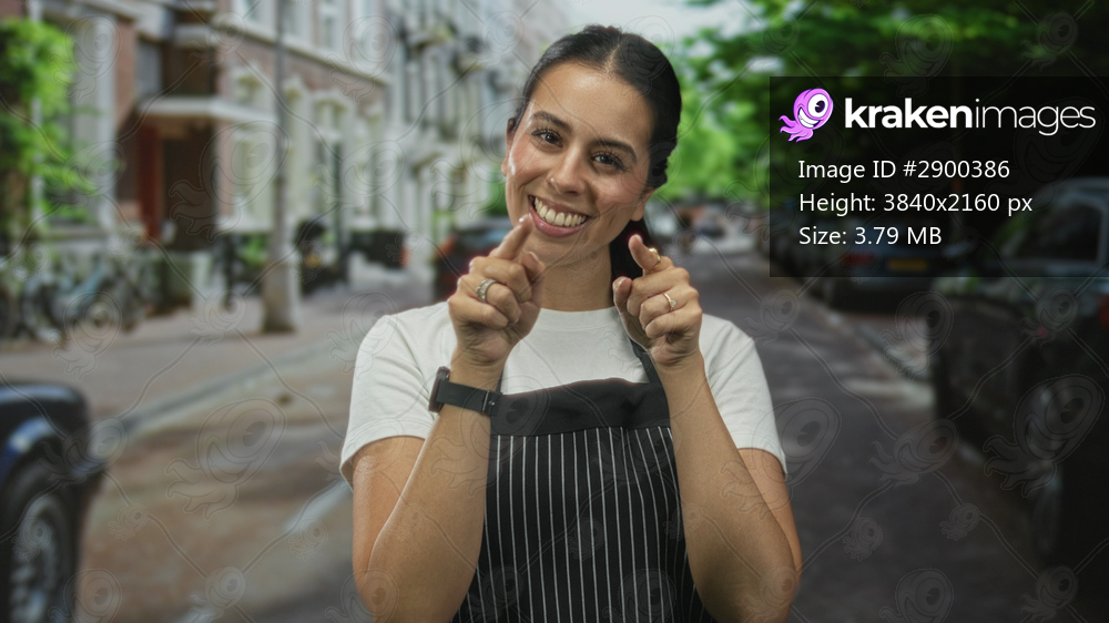 Smiling young brunette woman in striped apron points finger forward on city street; welcoming invitation.