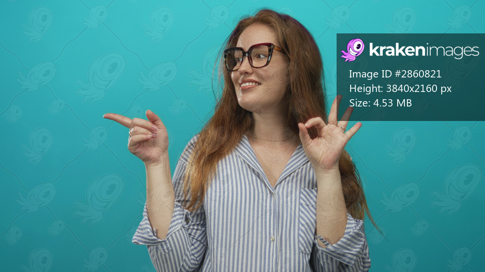 Smiling young caucasian woman with eyeglasses holds ok sign and points finger in teal studio; approval.