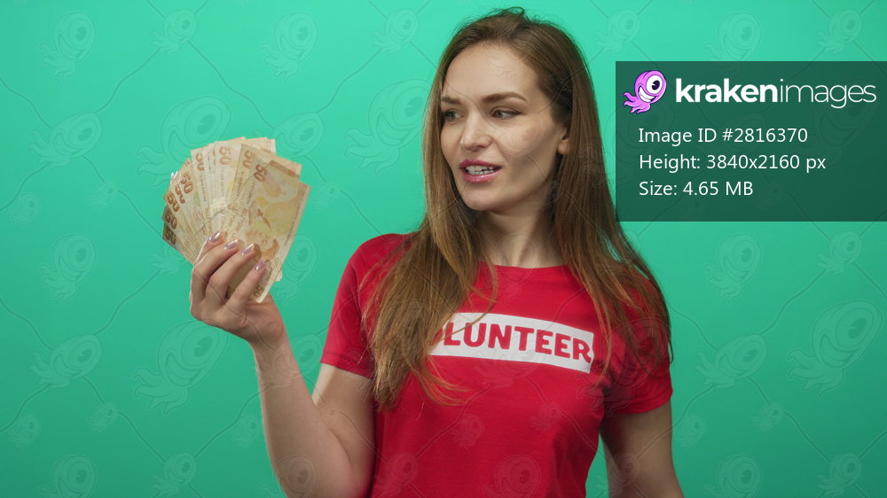 Smiling young caucasian woman holding lira banknotes with hand in green studio; charity support optimism.