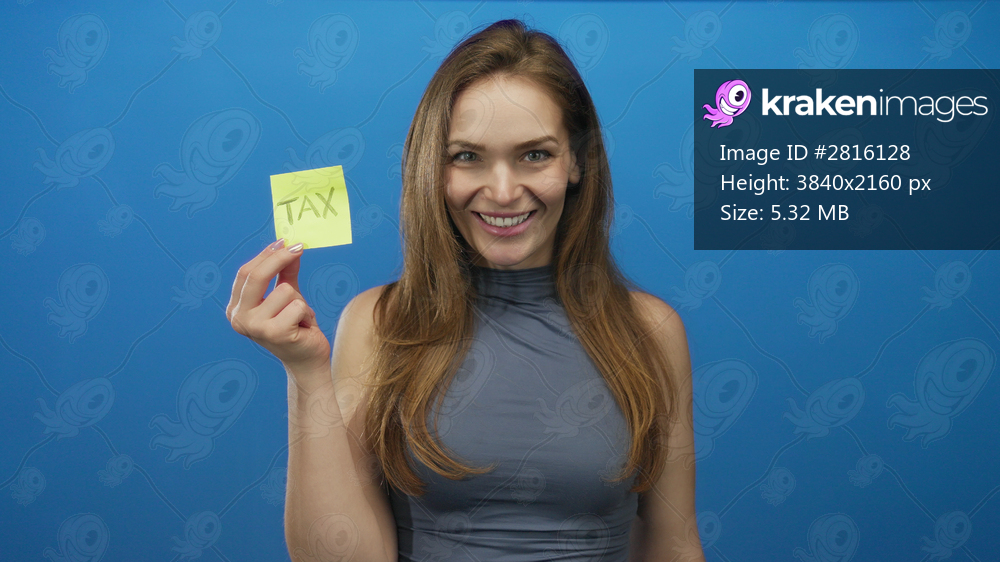Smiling young caucasian woman holds yellow sticky note labeled tax with palm up against a blue studio backdrop; confidence.