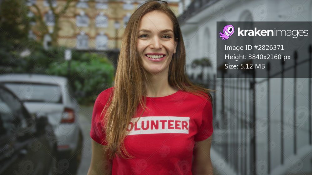 Smiling young caucasian woman pointing thumb to red volunteer shirt on city street near fence and parked car; pride service.