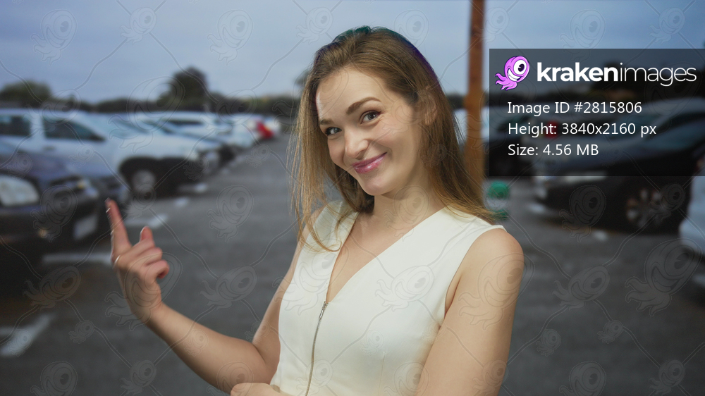 Smiling young caucasian woman points finger to white car in street; joy guidance recommendation choice.
