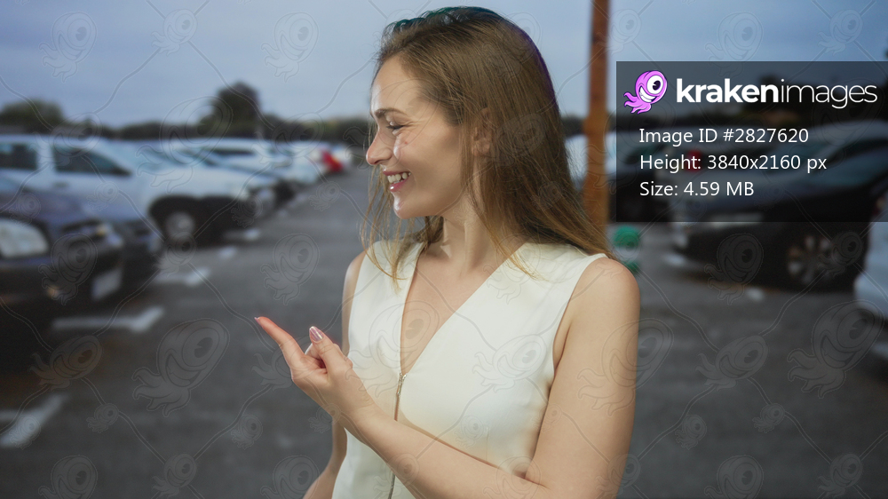Smiling young caucasian woman points finger to white car in street; joy guidance recommendation choice.