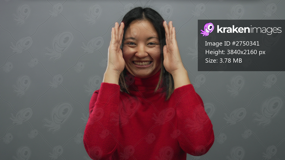 Smiling young chinese woman in red sweater reveals her face from behind hands against a plain grey background.