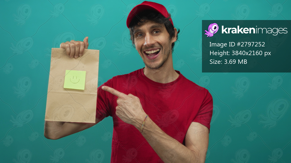 Smiling young deliveryman holds paper bag and finger pointing to smiley note in studio; happiness satisfaction.