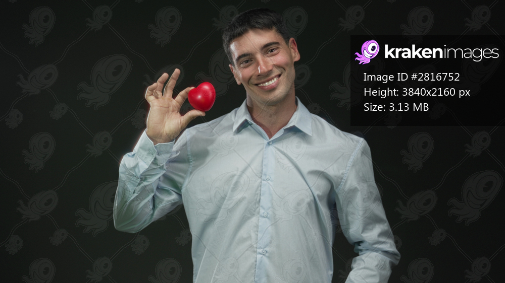 Smiling young hispanic man holding red heart shape between fingers in black studio setting wearing light blue shirt; love romance.